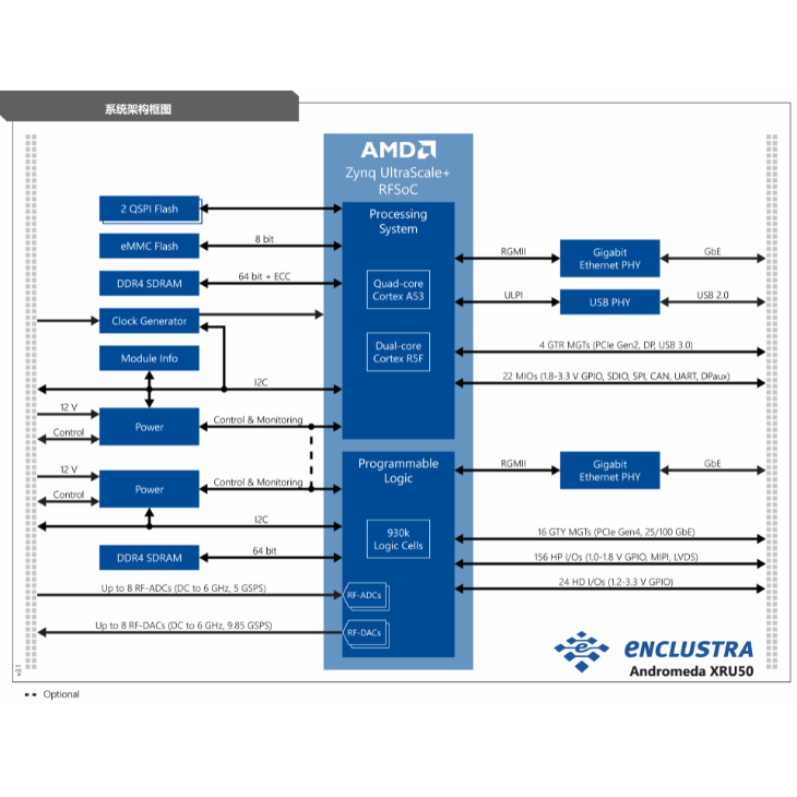 Enclustra Andromeda XRU50 RFSoC 模块为新一代射频系统提供了卓越的射频性能,并以集成化、紧凑型、高能效的封装形式呈现。该模块搭载先进的片上系统(SoC),集成多路射频数模转换器(RF-DAC)和射频模数转换器(RF-ADC),可直接合成射频信号,无需复杂的模拟电路,大幅简化 FPGA 系统设计。Andromeda XRU50 RFSoC 采用当前市场上极为紧凑的封装尺寸,在确保卓越射频性能的同时毫不妥协。该模块具备无与伦比的灵活性,广泛适用于各类嵌入式应用场景——涵盖新一代无线与卫星通信系统、测试测量设备,乃至量子计算领域。