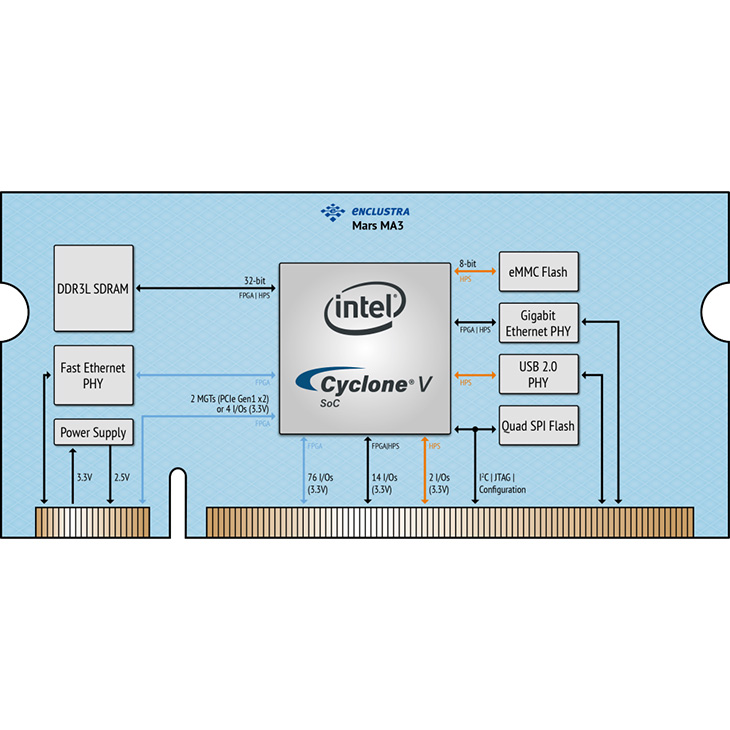 火星Mars MA3片上系统(SoC)核心板通过结合Intel的Cyclone V SoC芯片、快速DDR3L SDRAM、eMMC flash、QSPI flash、Gigabit Ethernet PHY、10/100Mbps Ethernet PHY和RTC形成了一个高性能嵌入式处理方案。